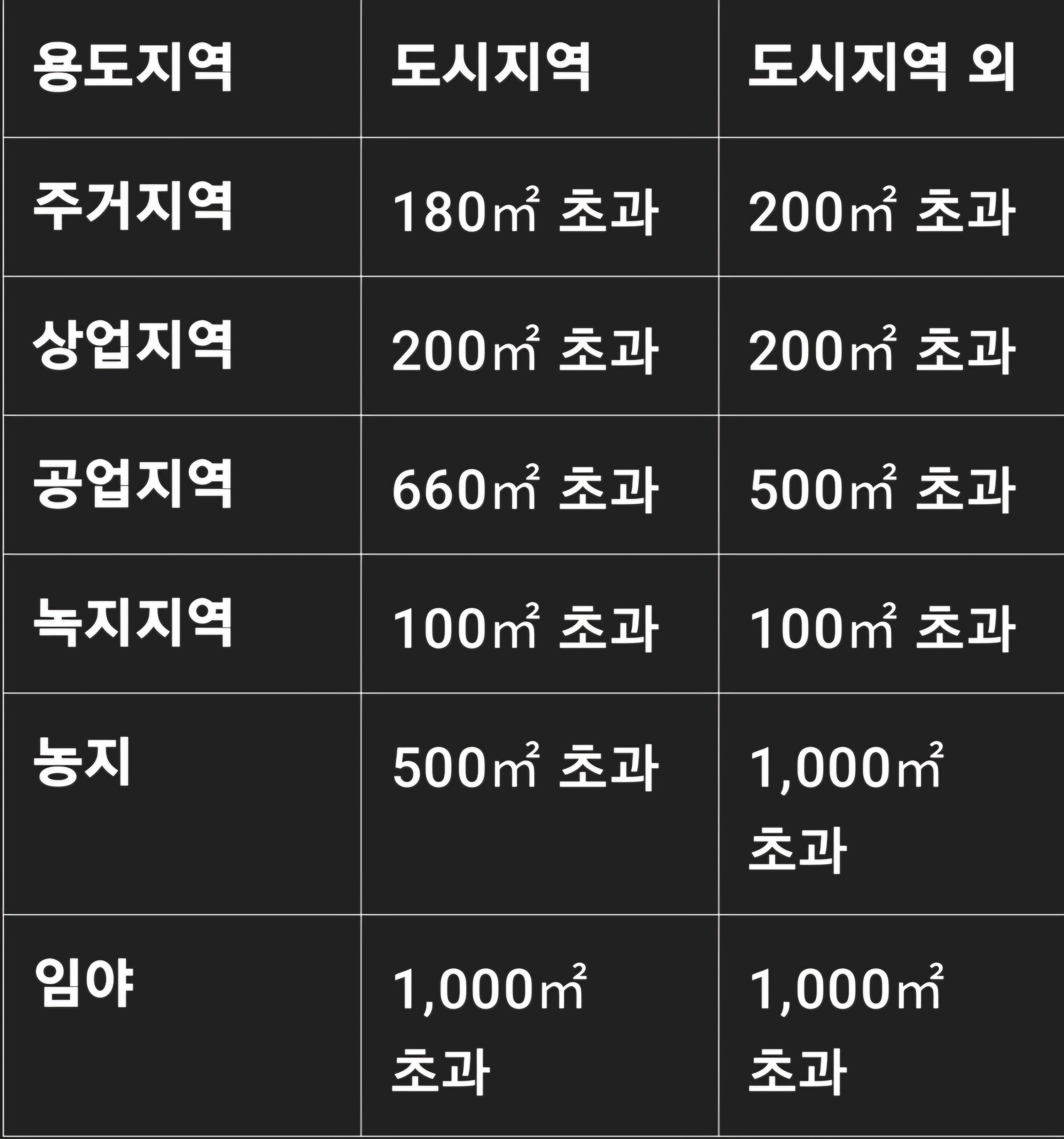 토지거래허가구역에서는 아래 면적을 초과하는 경우 허가를 받아야 합니다.