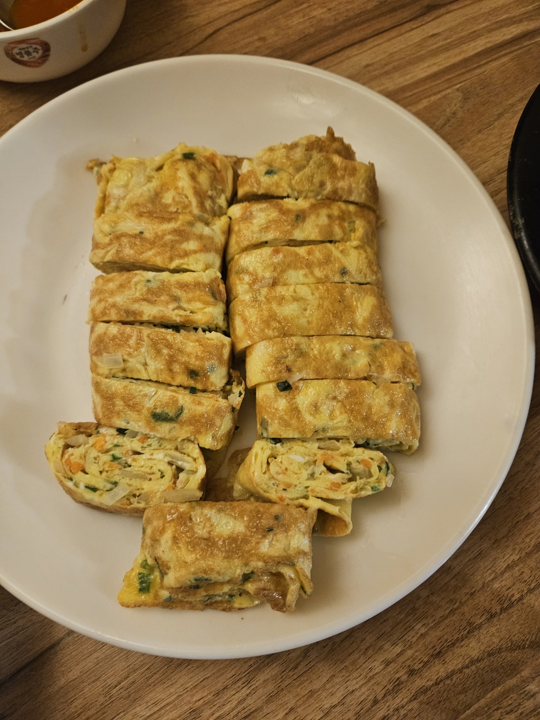 계란말이는 부드럽고 도톰하게 잘 말려 있어 찌개와 환상의 조합을 이룹니다.